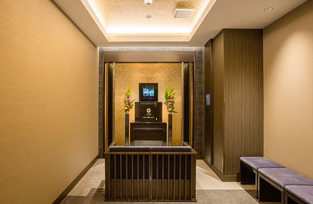 お客様が参拝室に到着すると、墓石に厨子と銘板がセットされ、ご参拝の準備が整っています。供花、お線香の準備、お墓のお手入れは専任スタッフが管理いたしますので手ぶらでお参りいただけます。